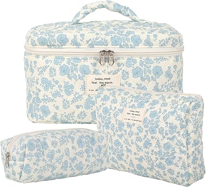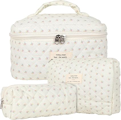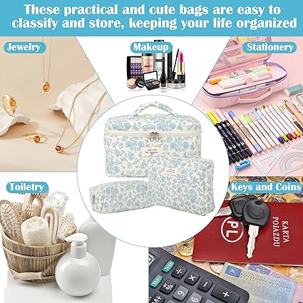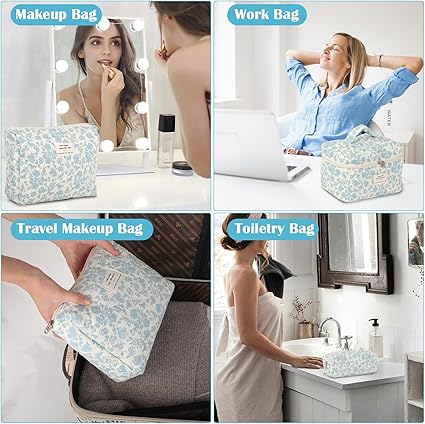 La bolsa de maquillaje acolchada de algodón se puede utilizar como bolso de mano diario, bolsa organizadora de cosméticos y productos para el cuidado de la piel, bolsa de almacenamiento y bolsa de artículos de tocador de viaje. Estas grandes bolsas de maquillaje son las compañeras ideales para sus viajes, viajes de negocios o uso diario.