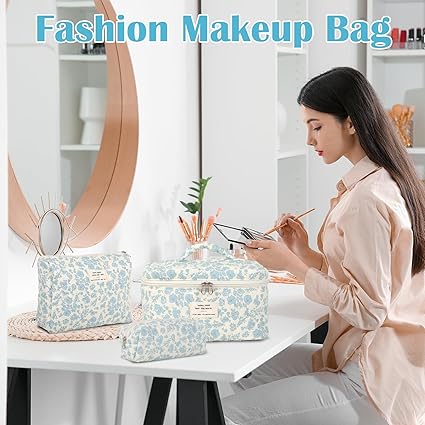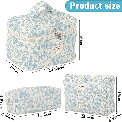 El juego de bolsas de maquillaje con diseño floral contiene tres tamaños diferentes de bolsas: 25 x 16 x 16 cm (grande), 25,4 x 15 x 8 cm (mediana), 18,2 x 5 x 5 cm (pequeña). Los diferentes tamaños de la bolsa te permiten ordenar y organizar diferentes artículos.